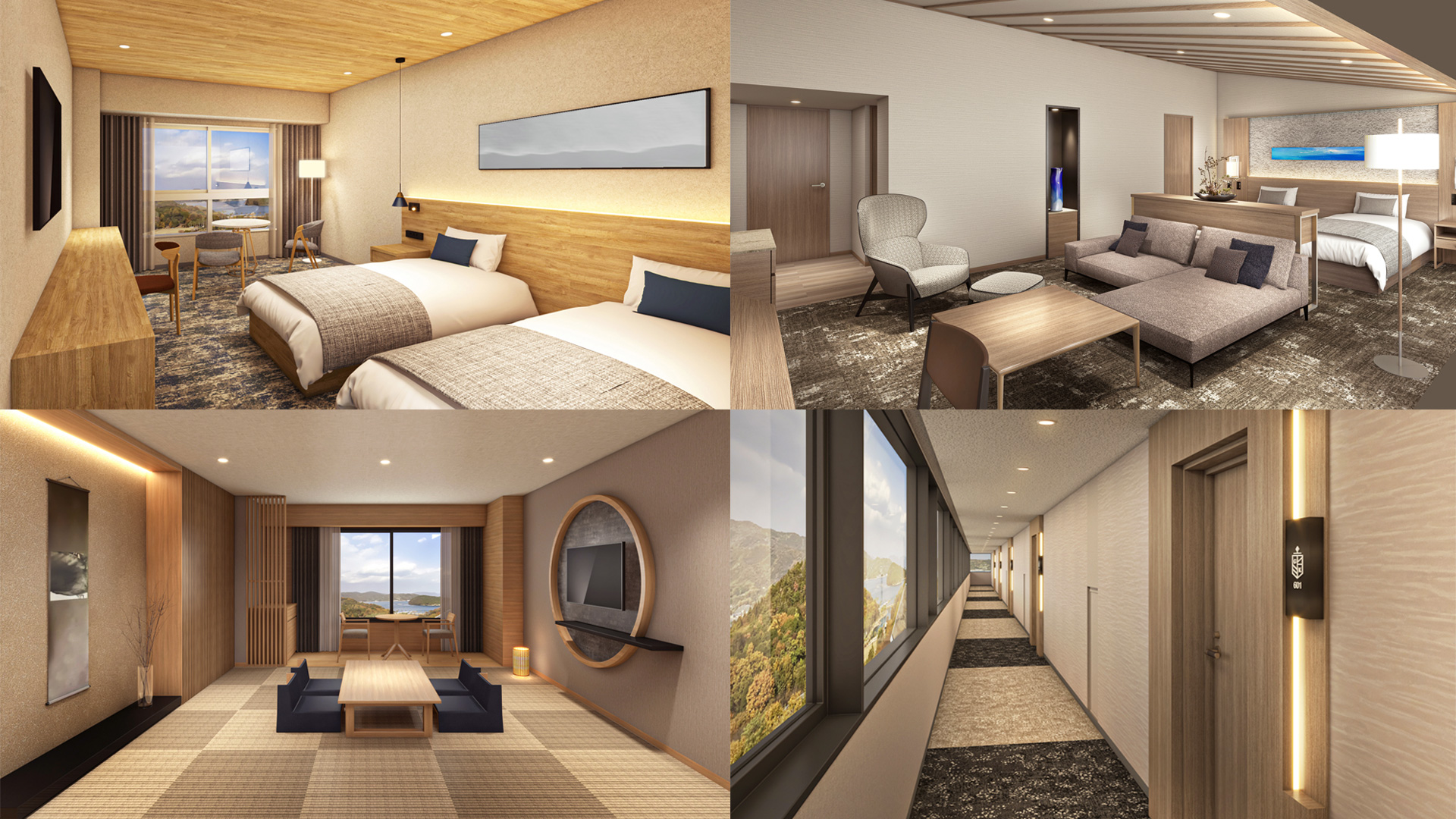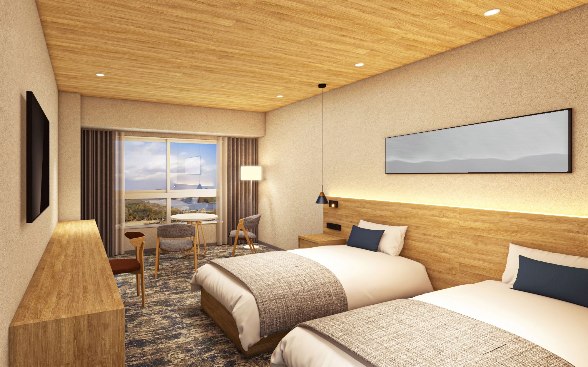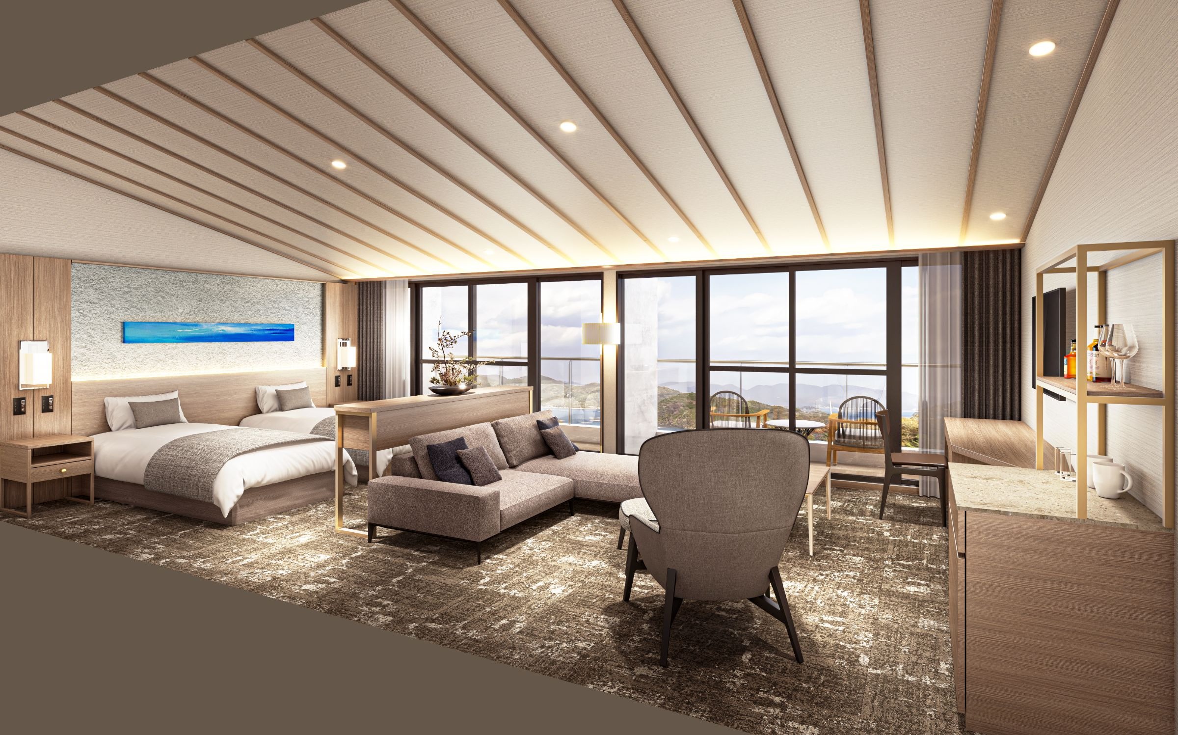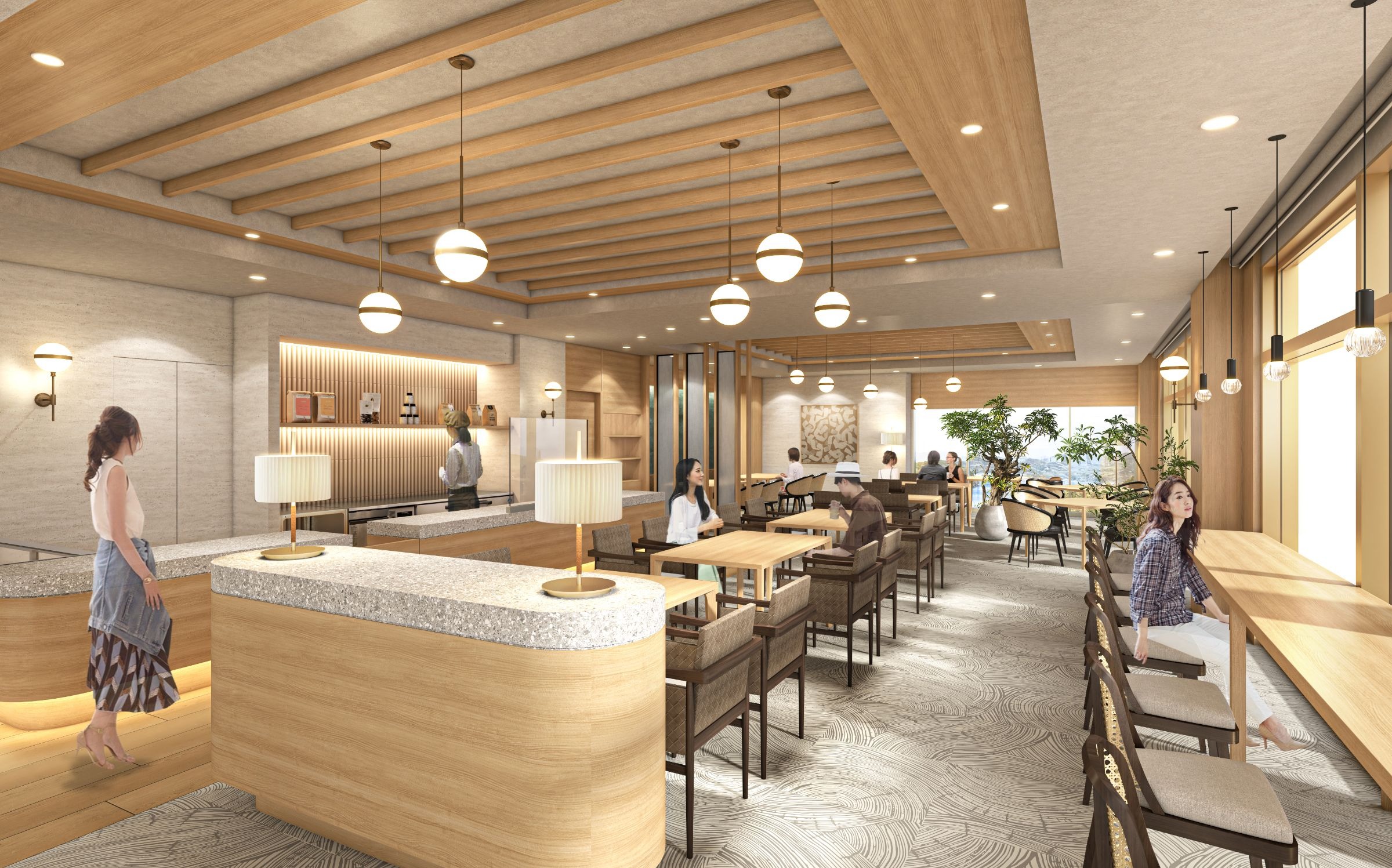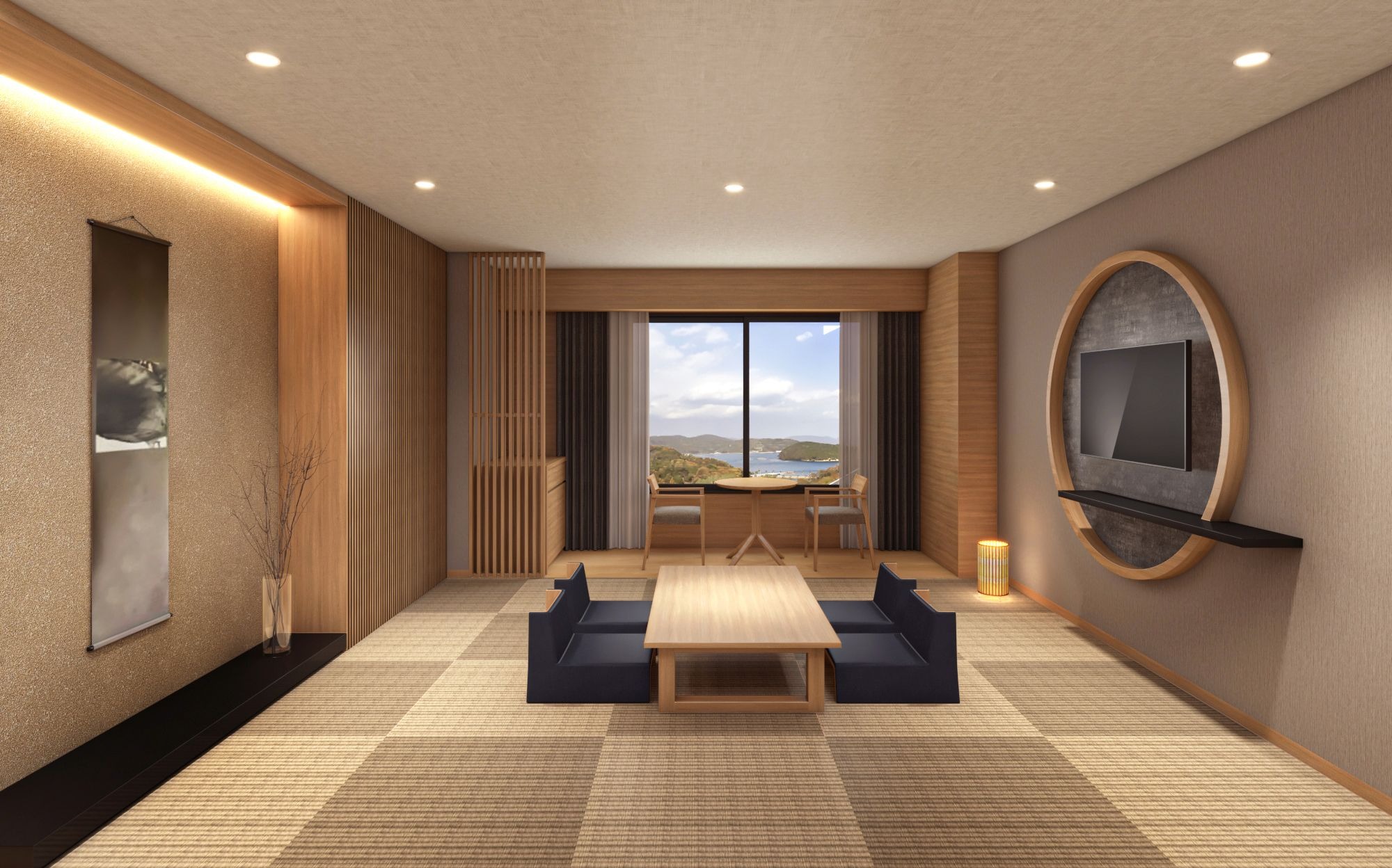 せとうちの魅力を現代風モダンで表現し、シンプルながらも温かみを感じる空間を演出いたしました。