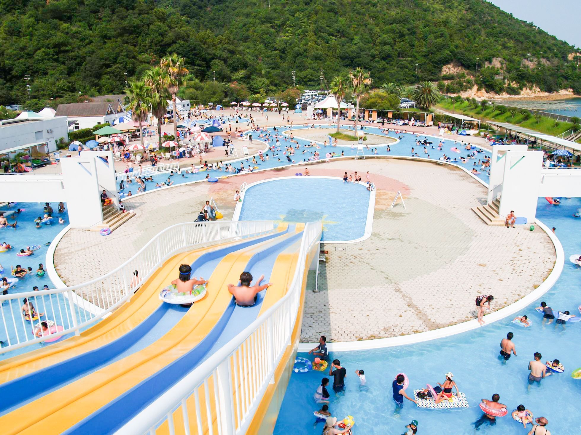 太陽と瀬戸内を背景に、水しぶきをあげて楽しめる「サンシャインプール」。