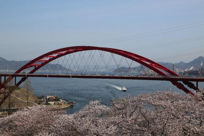 平清盛が夕日を招き返して1日で切り開いたという伝説のある名勝地。春には桜やツツジが咲き乱れ、「音戸大橋」と瀬戸内海がマッチした景観が楽しめます。